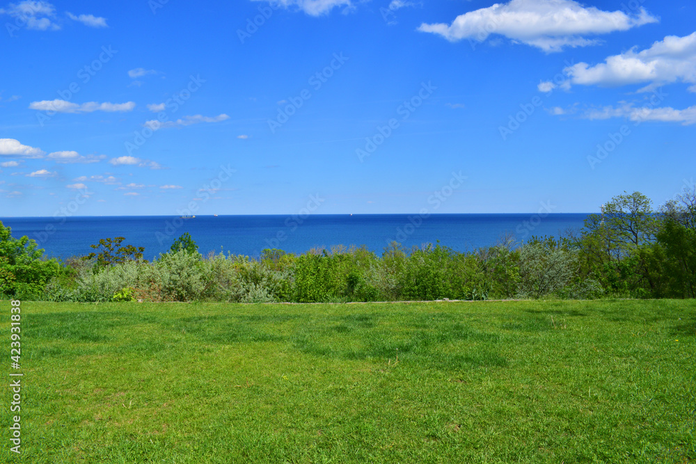 green meadow and blue sea. sunny summer day, seascape. A beautiful shot of green fields on a cliff with a ship on the sea in the background. summer rest
