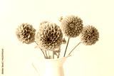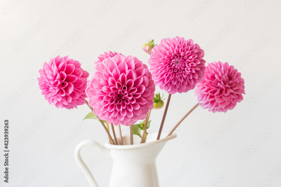 Closeup of bright pink dahlia blossom amongst bunch in white jug (selective focus)
