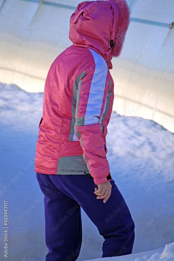 A woman in a down jacket walks along a snow-covered path to a garden greenhouse