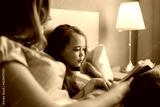 Close-up of happy young mother and adorable daughter reading together children book before going to sleep while lying in bed in nursery bedroom, near lamp. Concept of family leisure activity at home.