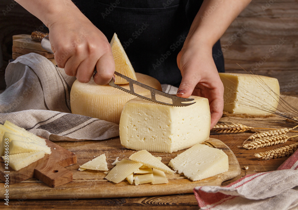 Hands cut pieces of fresh homemade cheese on a wooden board