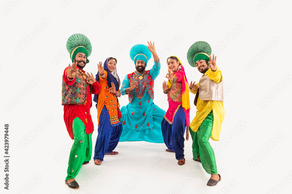 A Troupe of Punjabi Folk Dancers demonstrating a Dance step with hand Gestures.