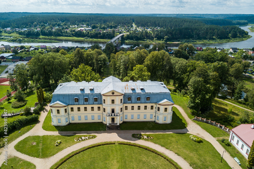 Aerial view of Kraslava town, castle and river Daugava, Latvia.