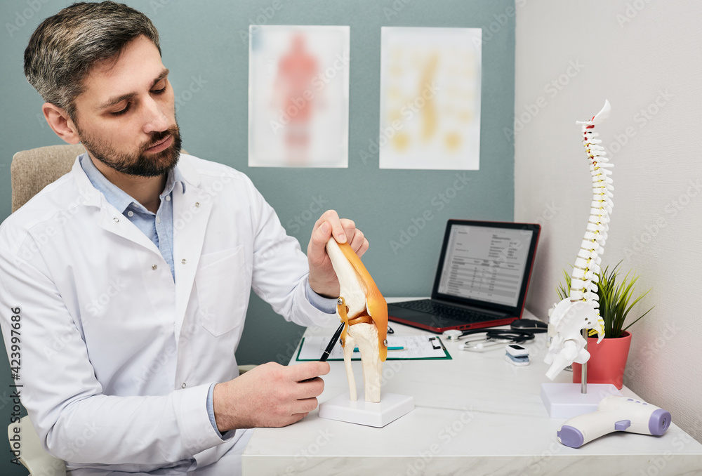 Mature doctor using a knee-joint anatomical model to analyze human knee problem areas and treatment