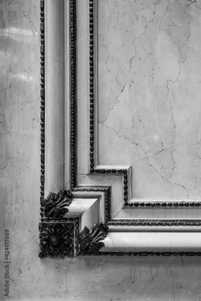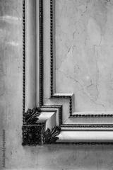 Different details of a luxurious theater with gold touches in black and white