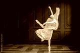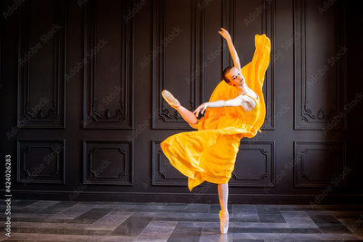 elegant ballerina in pointe shoes dances with flowing yellow fabric on a dark gray background