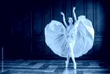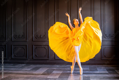 elegant ballerina in pointe shoes dances with flowing yellow fabric on a dark gray background