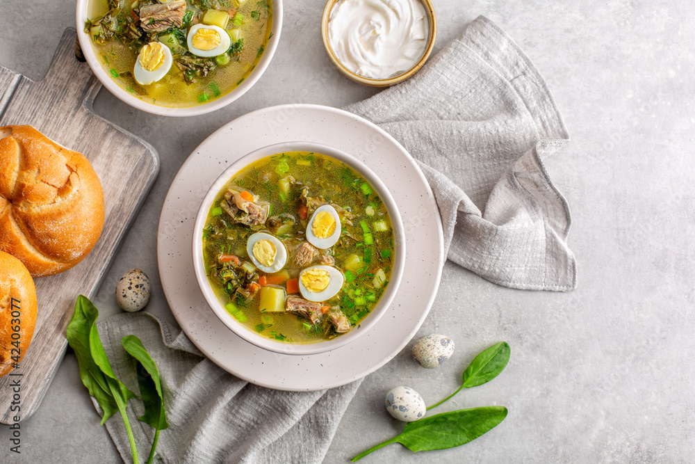 Sorrel soup made from beef broth, sorrel leaves, hard boiled quail eggs, potatoes, carrots, parsley.