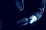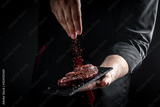Chef hands cooking meat steak and adding seasoning in a freeze motion. Fresh raw Prime Black Angus beef rump steak. banner, menu recipe