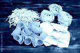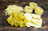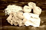 Assorted or set of Italian pasta on a wooden background. Lifestyle, rustic style.