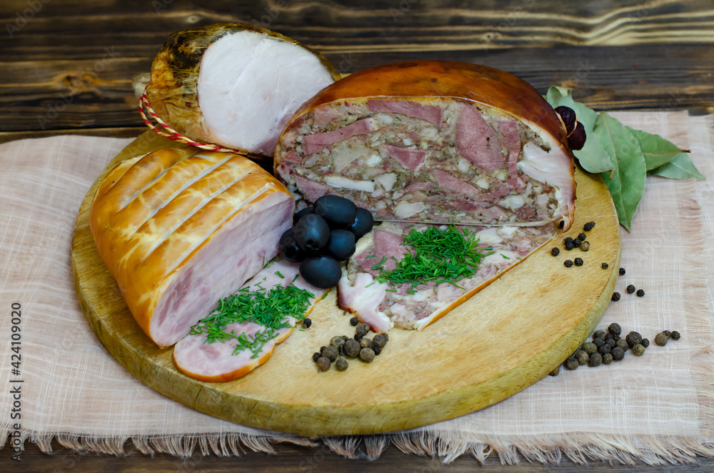 Set of homemade meat delicacies. Smoked chicken ham and pork belly on a round wooden board. Dark wooden rustic background. Copy space.