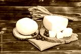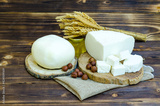 Set of different cheese on a wooden plate. Cheese platter with nuts and honey on a wooden background, copy space. Authentic, rustic style.
