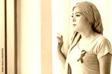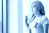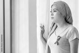 Portrait of a asian women disease mammary cancer patient with pink ribbon wearing headscarf After treatment to chemotherapy at the window In the bedroom at the house,healthcare,medicine