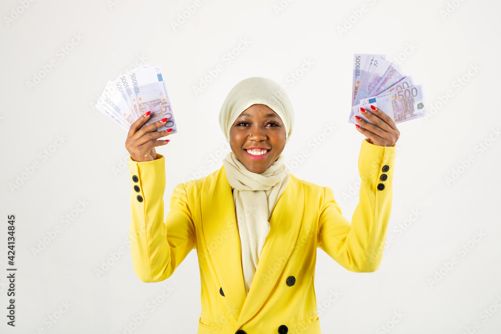 beautiful young african woman in a muslim headscarf with euro bills in her hands