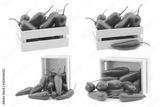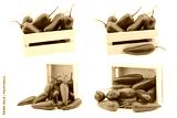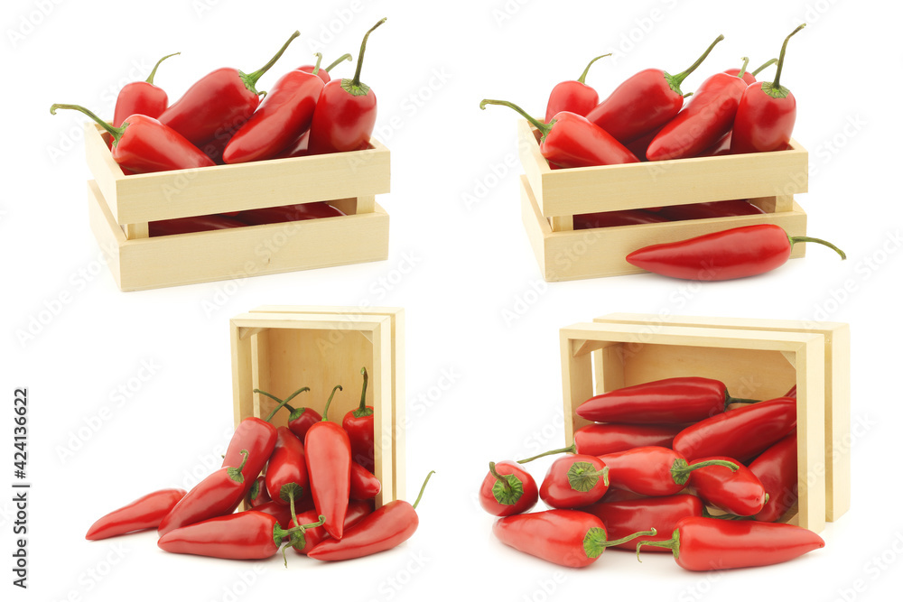 Red jalapeno peppers in a wooden box on a white background