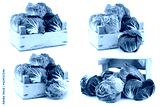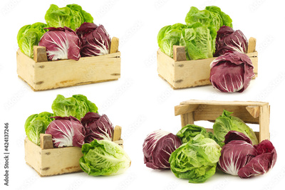 red "radicchio" lettuce and green "little gem"lettuce in a wooden box on a white background