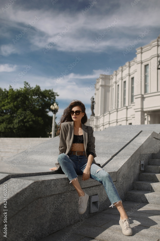 Young model woman in trendy sunglasses, jeans, and fashionable jacket posing outdoors in a European city in the summer day