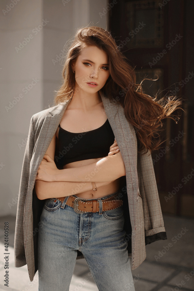 Fashion outdoor shoot of a beautiful model girl in trendy jacket and jeans