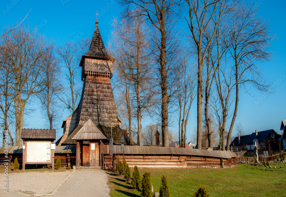 Debno, Poland. Medieval wooden Gothic church of the Saint Archangel Michael, built in 15th century, still active, with the oldest wooden polychrome in Europe inside. UNESCO World Heritage Site