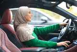 Happy muslim woman test driving new car in urban city