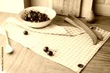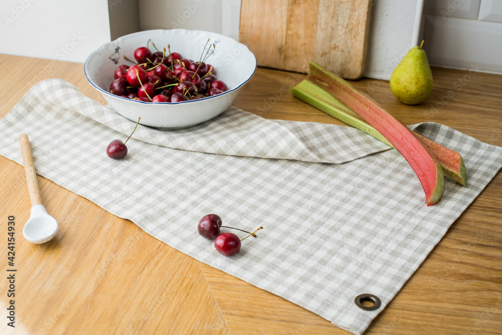 ripe red sweet cherries lying on table in a dish and on linen napkin.