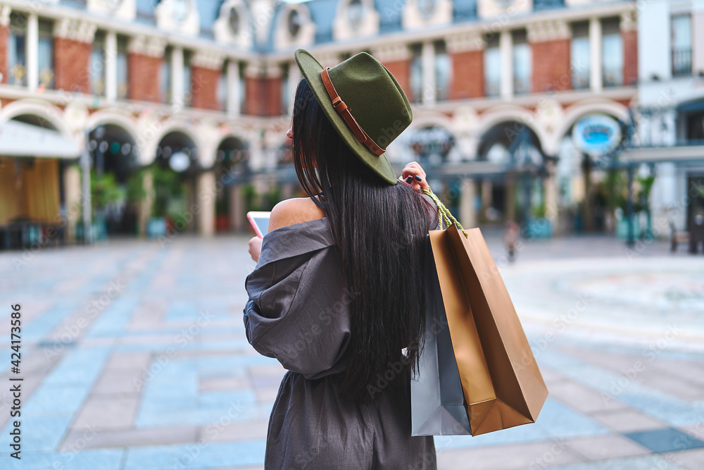 Stylish fashionable hipster brunette woman shopaholic with long hair wearing felt hat with paper shopping bags walks in the center of a european city during black friday sales week
