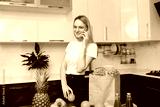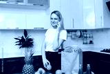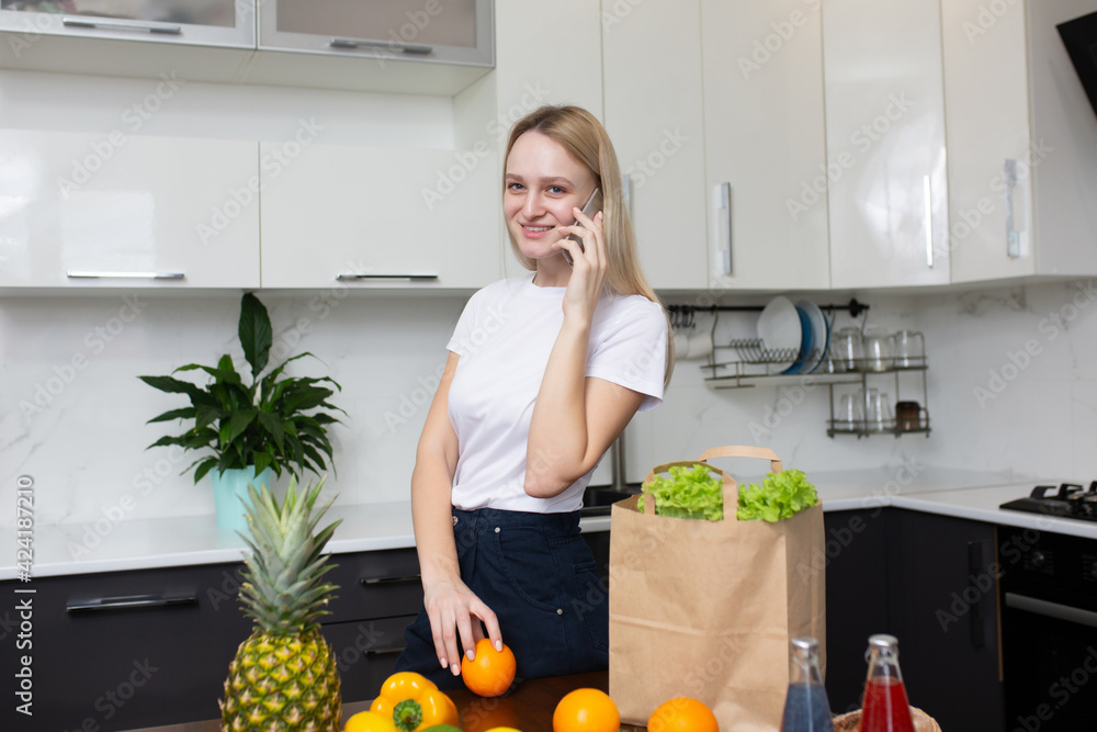 Young woman sorts purchases after shopping and talking on phone in the kitchen at home.