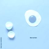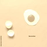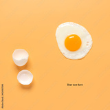 Fried egg and shells on a pastel yellow background. Creative layout. Minimalistic still life. Breakfast concept. Top view, flat lay, place for text.