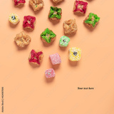 Middle Eastern sweets baklava and Turkish delight on a pastel peach background. Arabic traditional dessert. Ramadan. Top view.