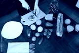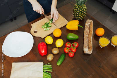Woman hands is cutting vegetables on wooden cutting board. Healthy eating. Top view.