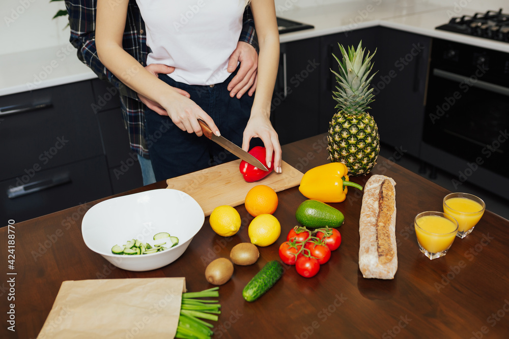 Couple cooking together in kitchen at home. Man hugging his woman from behind.