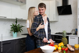 Happy young couple have fun in modern kitchen while preparing fresh fruit and vegetable salad. Woman hugging his man from behind.