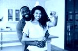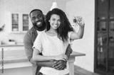 Hilarious multiracial couple moved in new house, an African guy is hugging his beautiful girlfriend, smiling woman shows keys from new property. Goal achievement concept