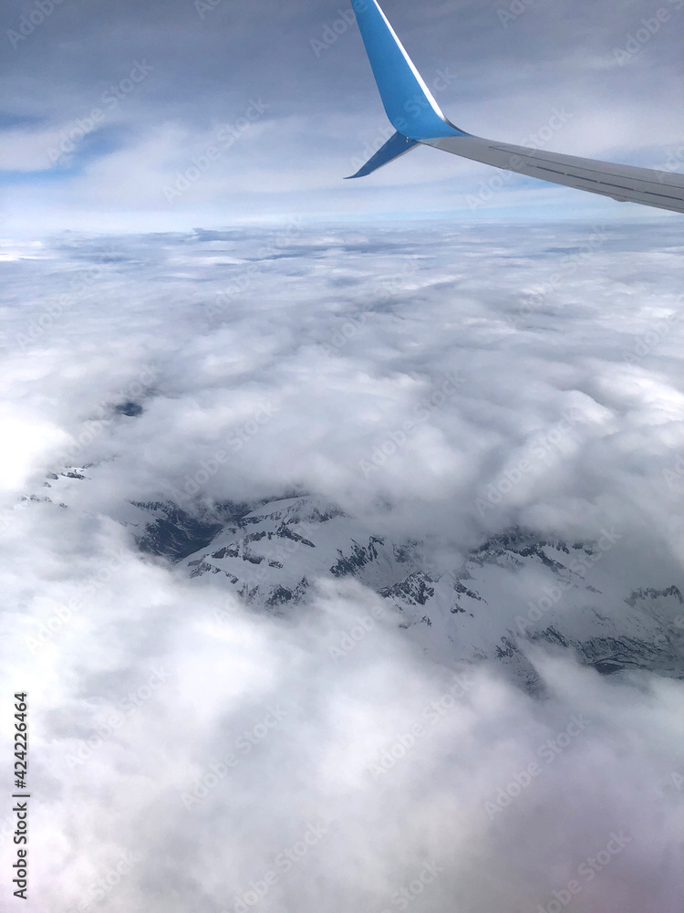 White clouds in the sky. View from the airplane window