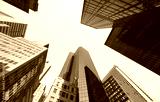 Looking up at Manhattan skyscrapers, New York City, USA.