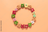 Round frame made of arabic dessert baklava and Turkish delight on a pastel peach background. Ramadan. Top view, flat lay.