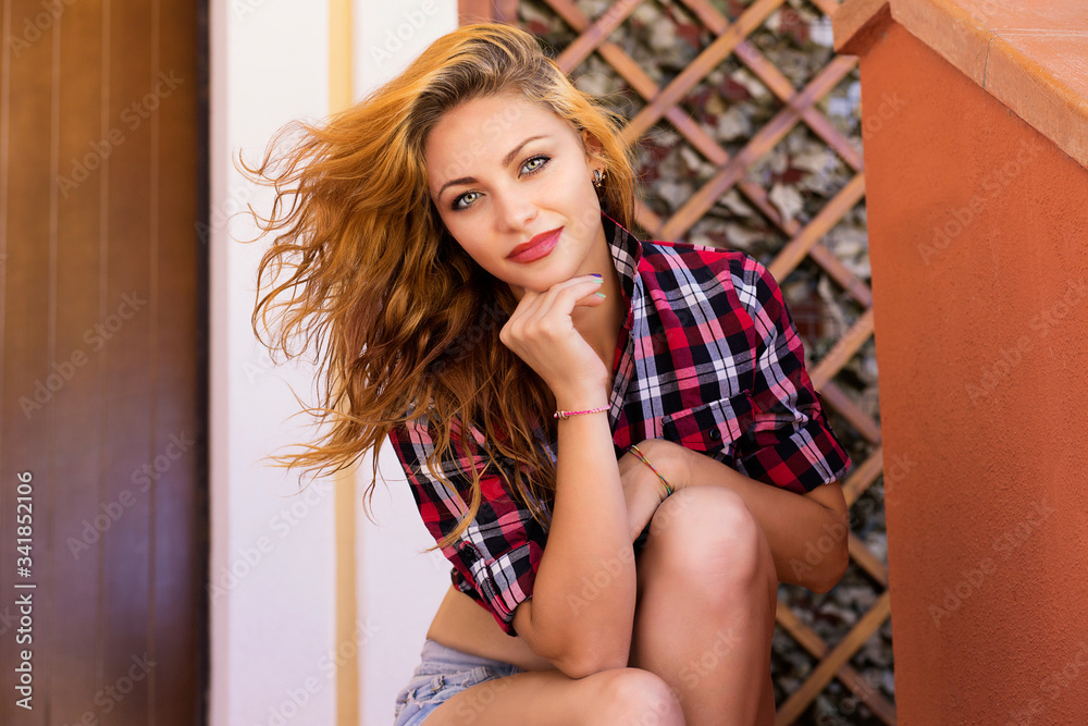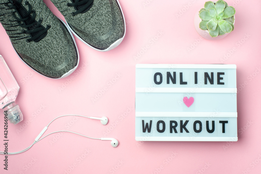 Online Workout - text on display lightbox on pink background. Flat lay - Sneakers, a bottle of water, white headphones. Sport concept.