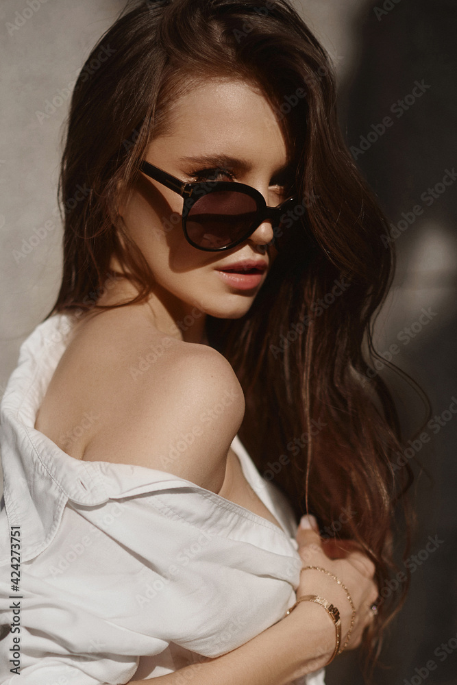 Fashion portrait of a young woman in trendy sunglasses posing outdoors on the summer sunny day