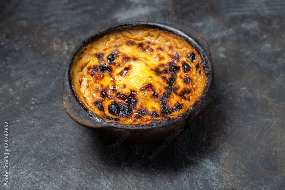 Chilean food. Traditional Pastel de Choclo corn pie. Beef meat with onion, chicken and egg covered with ground corn in clay bowl, top view