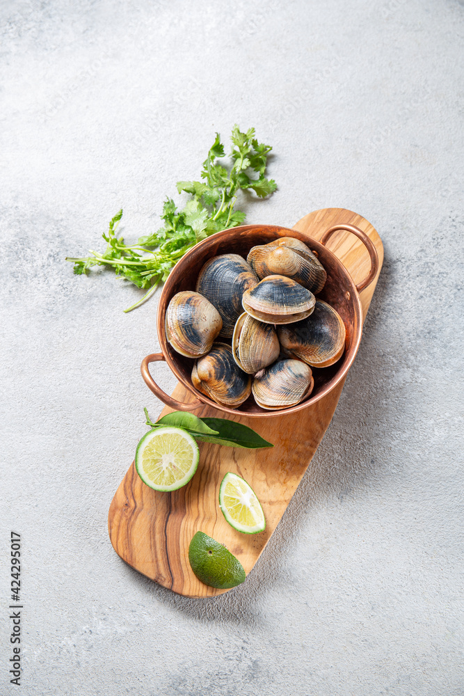 Raw uncooked clams vongole shells shellfish with ingredients for cooking coriandr, beer and lime in cooper bowl on gray background