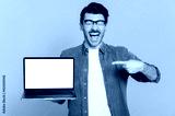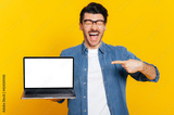 Happy shouting caucasian excited stylish guy with glasses, holds an open laptop with empty white screen, points finger at it, standing on isolated orange background, smiling friendly