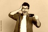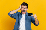 Happy cheerful stylish handsome caucasian guy with glasses, holds a credit card in hand, touches head with hand, looks amazed at camera, smiling, stand on isolated orange background,e-banking concept