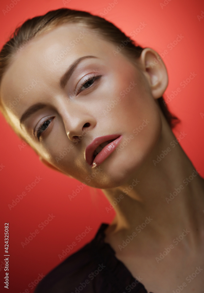 Young woman posing over red backround, beauty concept