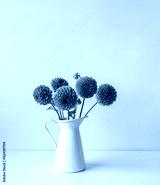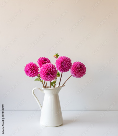 Bright pink dahlias in white jug on table against wall (selective focus)