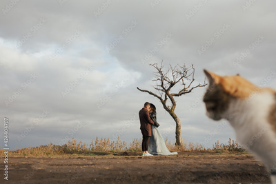 Kissing couple on a beautiful sunny day kissing near the tree. Cat on the foreground.