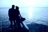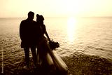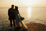 Stylish groom and tender bride in long dress with bouquet in hand girl look at the beautiful orange sunset near the sea.