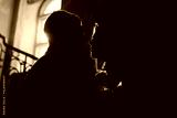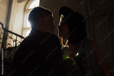 Dark silhouette of couple who want to kiss near the big window with sunlight.