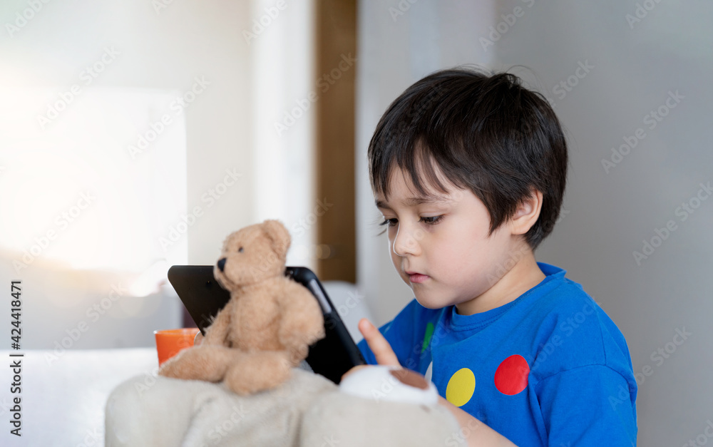 School Kid using tablet for his homework, Child looking at digital tablet with thinking face, Young boy watching cartoon on touch pad, new normal life stye with learning online, Home learning concept