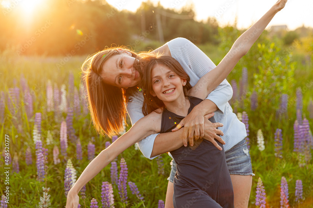 Young mother embracing her child outdoor. Woman and teenage girl on summer field with blooming wild flowers green background. Happy family mom and daughter playing on meadow.