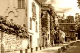 Montmartre in Paris, a very romantic parisian street and houses, with the basilica Sacre-Coeur in background